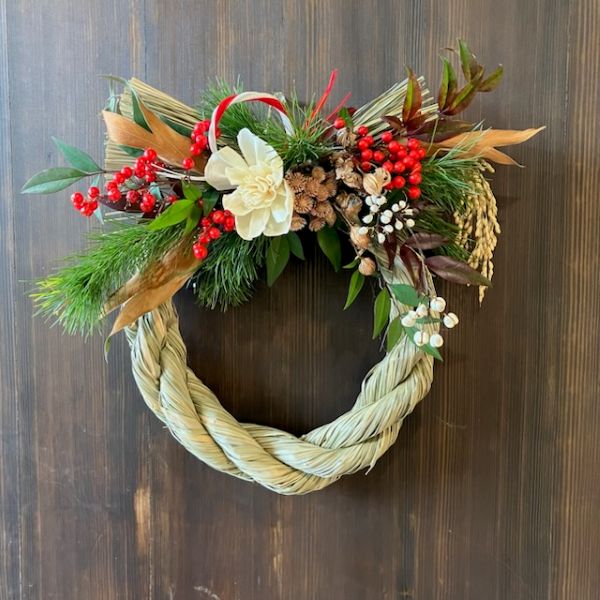 どっしりとした定番のしめ縄のお飾りです。木の皮で作った白いお花と赤い南天の紅白のコントラストが美しいお飾りです。可愛らしい感じが好みの方におすすめです。